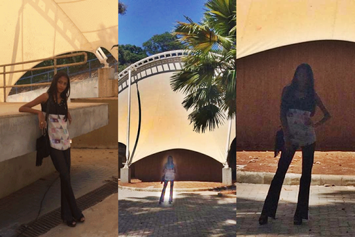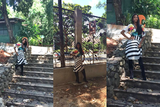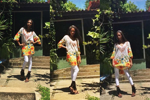 Neste look Iana evidencia cores vibrantes mescladas ao desenho do pássaro tucano, misturadas com cores clássicas em branco e preto e listras,que é uma das tendências mais usadas, em qualquer estação.