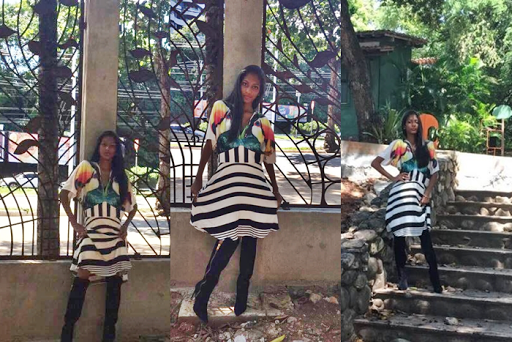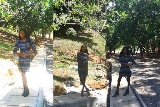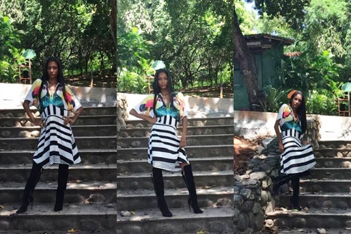 Ciente do seu carisma, a modelo Iana fez novas poses de tirar o fôlego, usando este vestido com estampa de tucano colorido com listras clássicas em preta e branco, horizontais e verticais e bota Over the Knee.