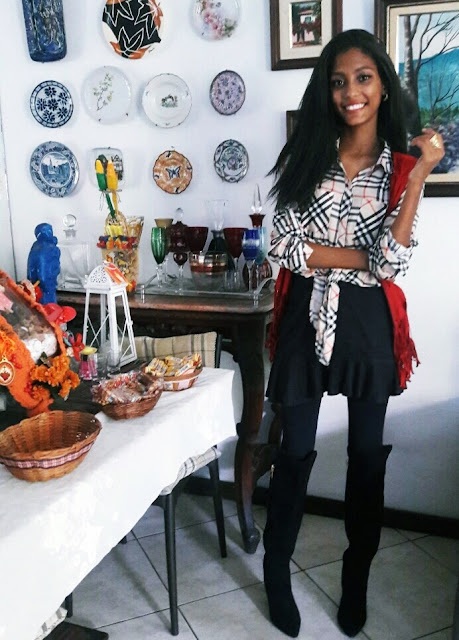 Nosso São João foi uma festança só! A nossa jornalista Noeli de Carvalho veste bota marrom, saia longa xadrez em marrom e azul, para finalizar o look camiseta de camurça nude.