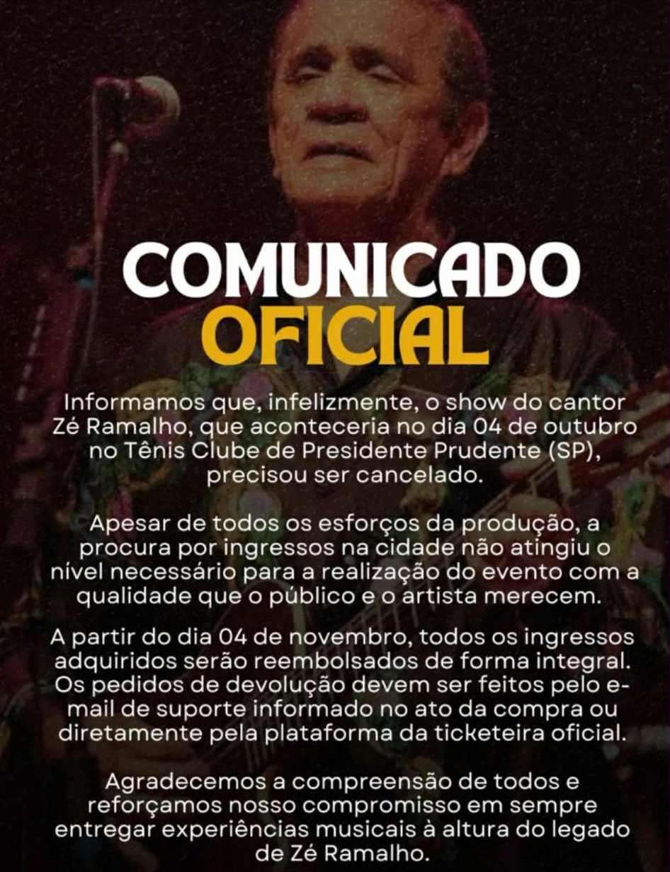 O show do cantor Zé Ramalho que estava marcado para o dia 04 de outubro no Tênis Clube de Presidente Prudente, foi cancelado.