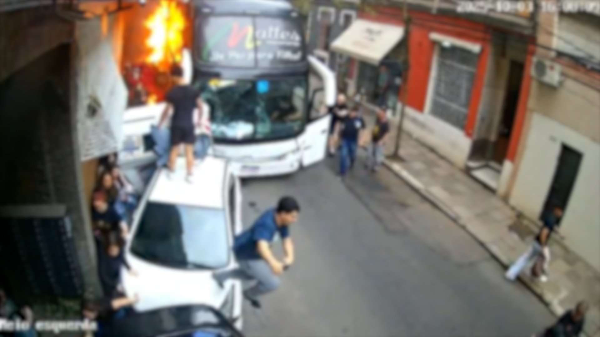 O incidente chamou a atenção de comerciantes e pedestres que estavam na região central no momento do acidente. As imagens captadas pelos sistemas de monitoramento mostram não apenas a colisão, mas também o início do fogo que se propagou pelo veículo após o impacto.