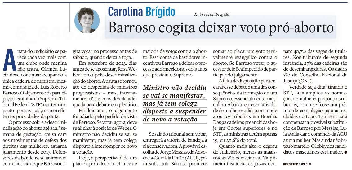 A ‘repórter especial’ Carolina Brígido lamenta que o Supremo seja dominado por homens. Houvesse mais mulheres, o aborto já teria sido liberado no Brasil (O fato de considerar normal o STF reescrever a lei é apenas um detalhe nos dias que correm. Sigamos).