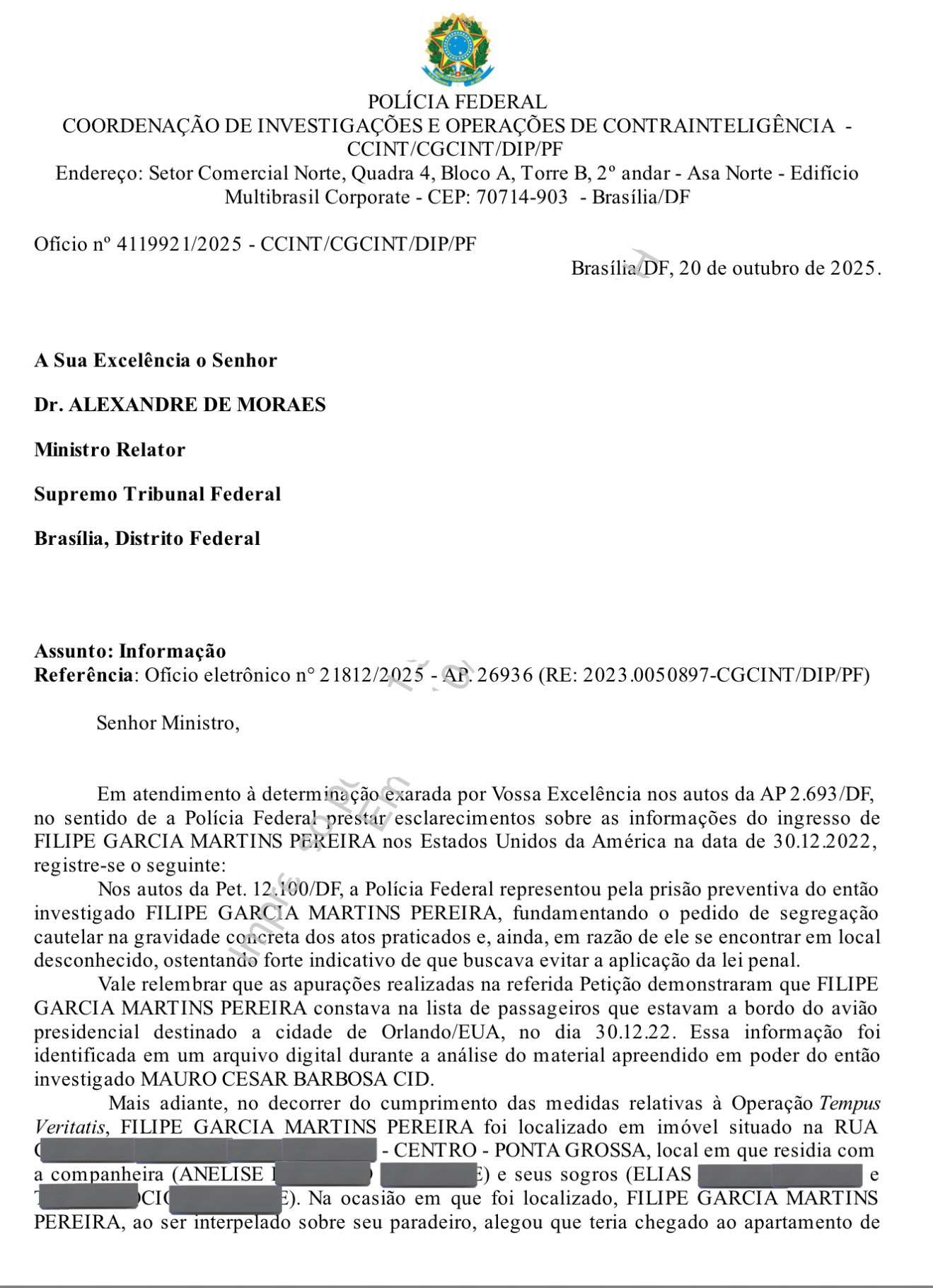 Segundo a PF, a entrada falsa pode ter sido forjada por “comparsas” de Filipe, numa tentativa de “embaraçar” as investigações. A versão, no entanto, ignora que as autoridades tiveram acesso a dados de geolocalização do celular de Filipe e a comprovantes de viagem que demonstram que ele estava no Brasil durante todo o período — e, mesmo assim, ele foi mantido preso.