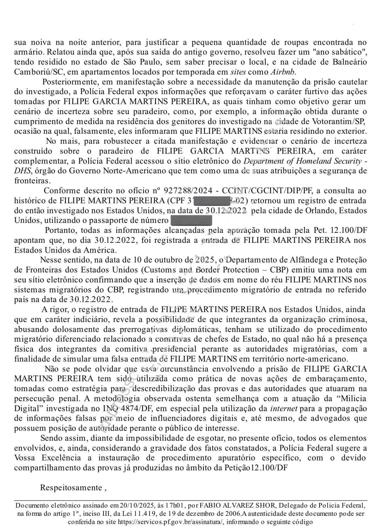 O delegado da Polícia Federal responsável pelo caso, em vez de responder às acusações — que apontam para o uso de provas falsas com o aval de um ministro já sancionado pelos Estados Unidos —, decidiu fazer novas acusações contra Filipe Martins.