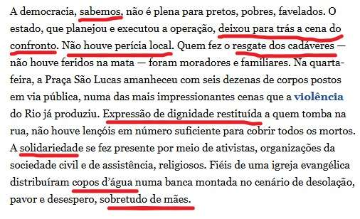 Dispensável comentar que ela trata os mortos como “4 policiais e 117 suspeitos”. Que bonitinho… não há que se dizer em “suspeitos”, pois a publicação foi feita na data de hoje, mas também que já foi divulgado (que ela mesmo cita no artigo), um levantamento (ainda em andamento), que entre os criminosos mortos, já foram identificados 78 com histórico de crimes graves, sendo que 54 são de outros estados - 15 do Pará, 9 do Amazonas, 11 da Bahia, 4 do Ceará, 7 de Goiás, 4 do Espírito Santo, 1 do Mato Grosso, 1 de São Paulo e 2 da Paraíba. Isso evidencia que o Rio de Janeiro se tornou uma sede do crime organizado do Brasil. Será que tem a ver com a ADPF 635 do Fachin? Bobagem minha…