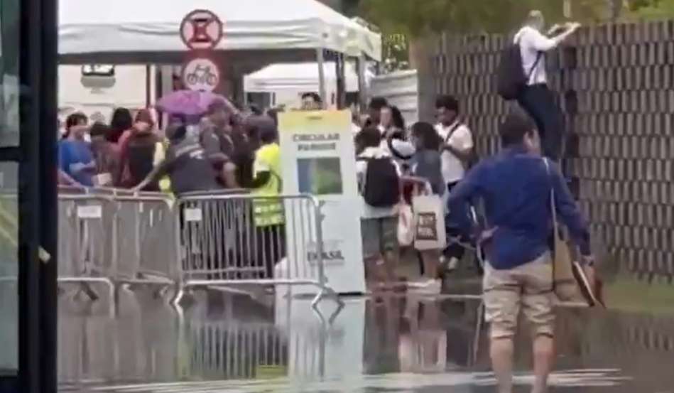 Na Avenida Júlio César, um dos principais acessos à chamada Blue Zone, o volume de água se acumulou sobre as calçadas, obrigando diversos participantes a retirar os sapatos e seguir descalços, carregando-os nas mãos.