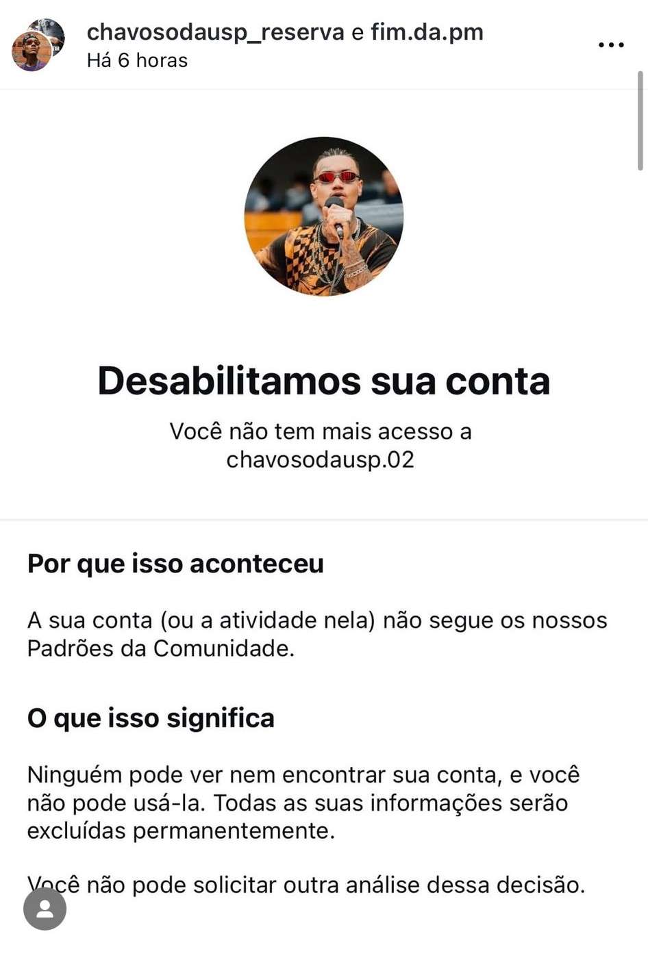 "É escandaloso o que está acontecendo! Sem qualquer justificativa, a Meta derrubou o acesso da conta principal do @chavosodausp, com mais de 1 milhão de seguidores. Um ataque direto à liberdade de expressão e ao trabalho de quem denuncia injustiças no Brasil."