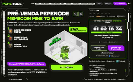 O PepeNode (PEPENODE) é o token que está quebrando a lógica do GameFi. Esqueça os altos custos da mineração virtual atual. Aqui, você monta rigs de mineração dentro de uma sala virtual e ganha recompensas reais em PEPENODE, Pepe e até Dogecoin.