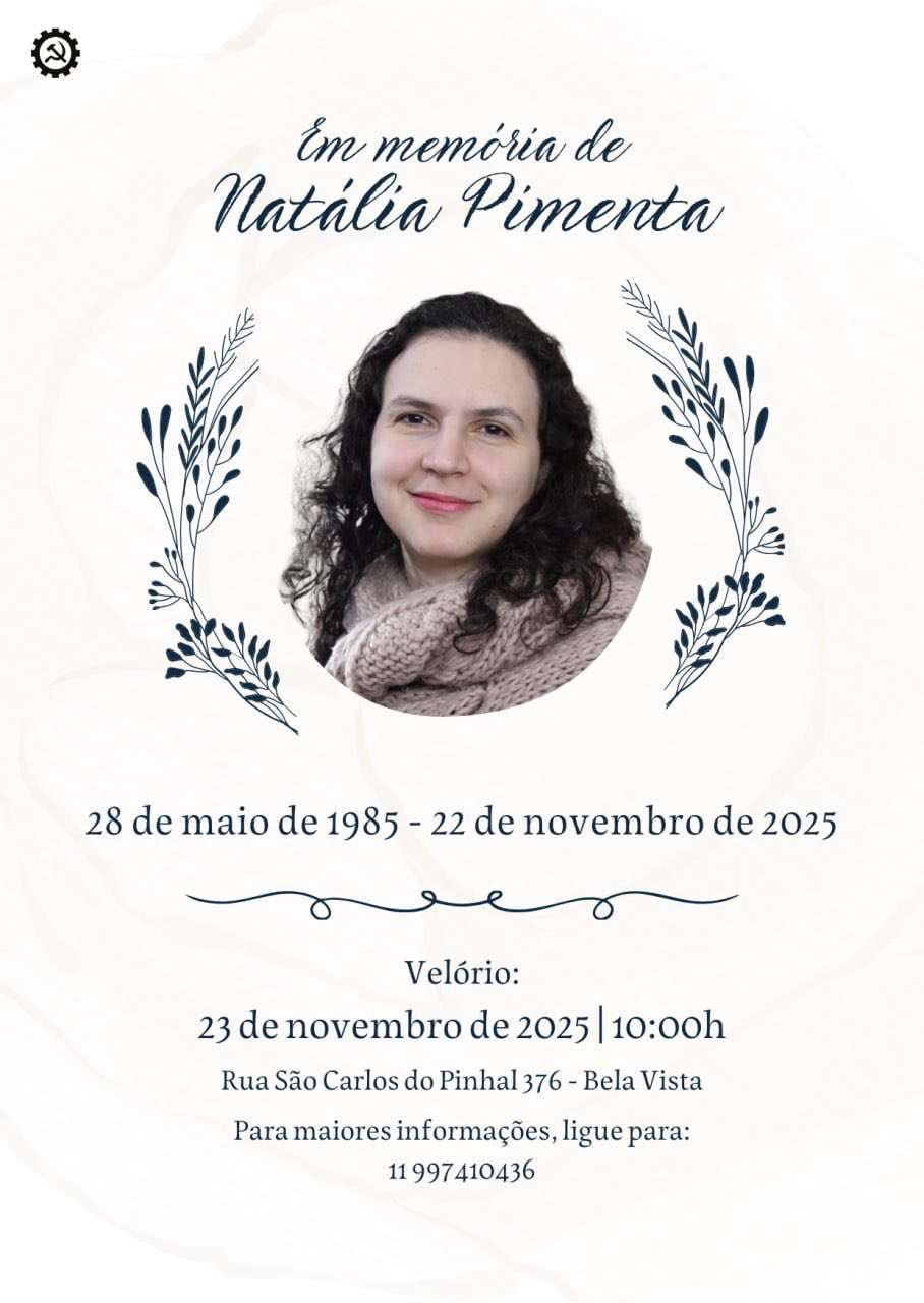 Na tarde deste sábado (22), morreu Natália Pimenta, dirigente nacional do Partido da Causa Operária (PCO) e filha do presidente do Partido, Rui Costa Pimenta.