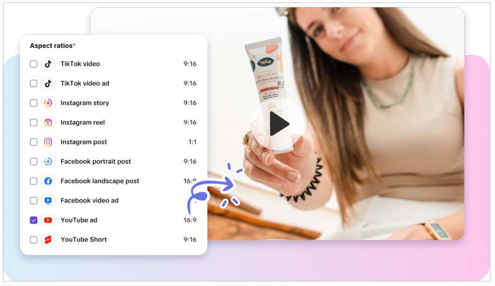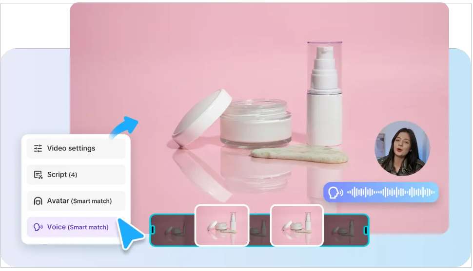 Depois de inserir o link, o motor de IA monta um vídeo pronto para anúncio com base no seu prompt, na mídia enviada e no conteúdo da página do produto. A IA controla o ritmo, as transições, os aprimoramentos e ainda adiciona avatares, voz, letras, legendas e visuais relevantes.