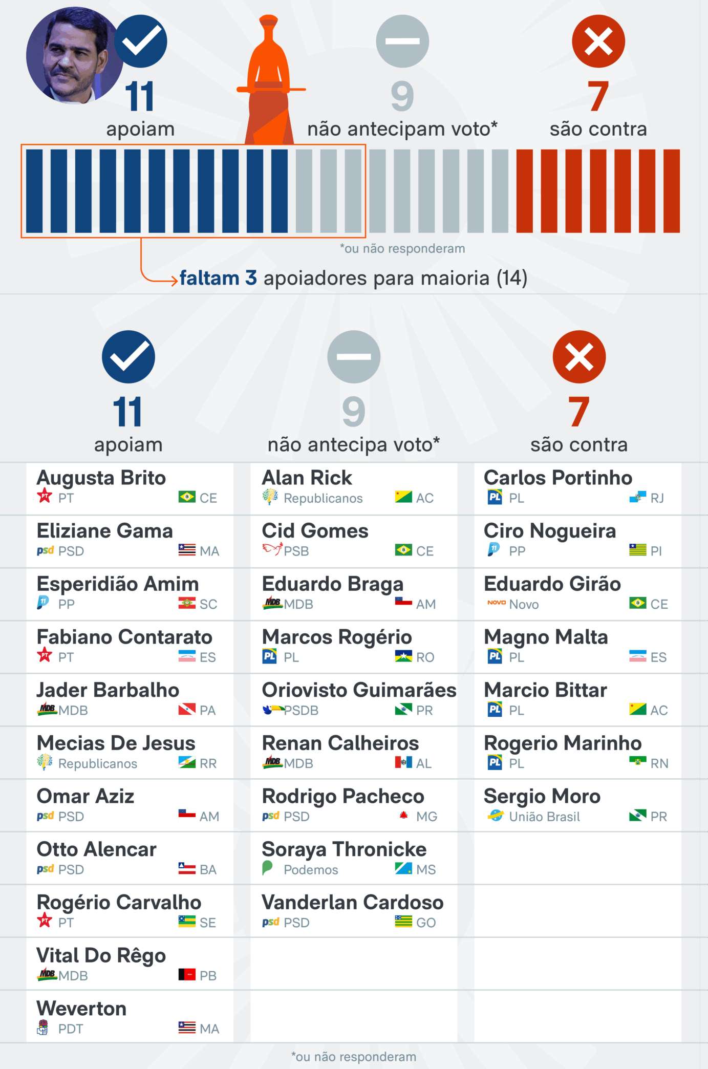 O advogado geral da União tem 11 votos assegurados na comissão, segundo o levantamento. Outros 7 senadores são contra, 3 não responderam e 6 não quiseram antecipar a posição. Messias precisa de ao menos 14 apoios para passar na CCJ.
