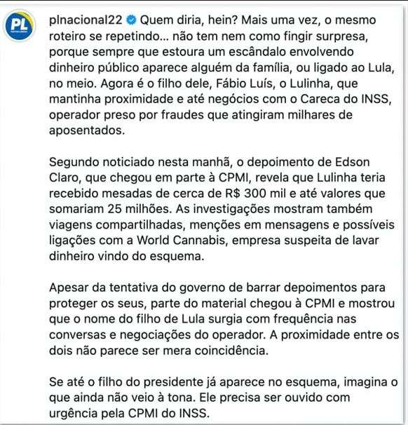 Na postagem, o PL afirma que Lulinha "precisa ser ouvido com urgência pela CPMI do INSS" e questiona "se até o filho do presidente já aparece no esquema, imagina o que ainda não veio à tona".
