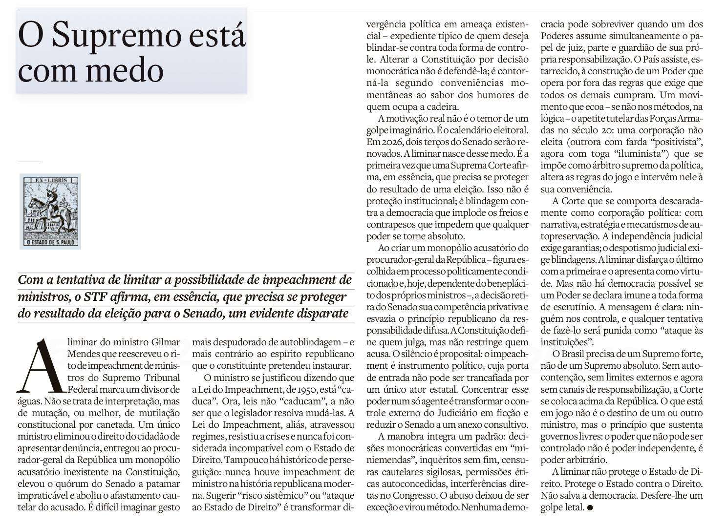 O ministro se justificou dizendo que a Lei do Impeachment, de 1950, está ‘caduca’. Ora, leis não ‘caducam’, a não ser que o legislador resolva mudá-las. A Lei do Impeachment, aliás, atravessou regimes, resistiu a crises e nunca foi considerada incompatível com o Estado de Direito. Tampouco há histórico de perseguição: nunca houve impeachment de ministro na história republicana moderna. Sugerir ‘risco sistêmico’ ou ‘ataque ao Estado de Direito’ é transformar divergência política em ameaça existencial – expediente típico de quem deseja blindar-se contra toda forma de controle. Alterar a Constituição por decisão monocrática não é defendê-la; é contorná-la segundo conveniências momentâneas ao sabor dos humores de quem ocupa a cadeira.