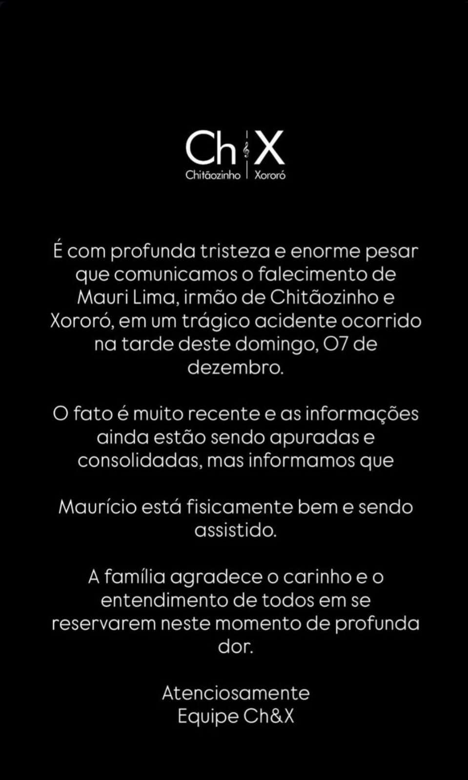 A equipe de Chitãozinho & Xororó divulgou um comunicado confirmando a morte do cantor e informando que Maurício, parceiro musical de Mauri, está fisicamente bem e sendo acompanhado. A nota também agradece o carinho e o respeito do público neste momento de profunda dor.