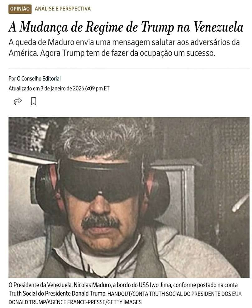 O The Wall Street Journal é o maior jornal dos Estados Unidos e claramente não tem tido um posicionamento simpático ao governo de Donald Trump. Por isso o seu posicionamento esclarecendo que não há nenhuma violação do direito internacional na intervenção americana, ganha mais relevância. Confira abaixo um trecho do editorial: