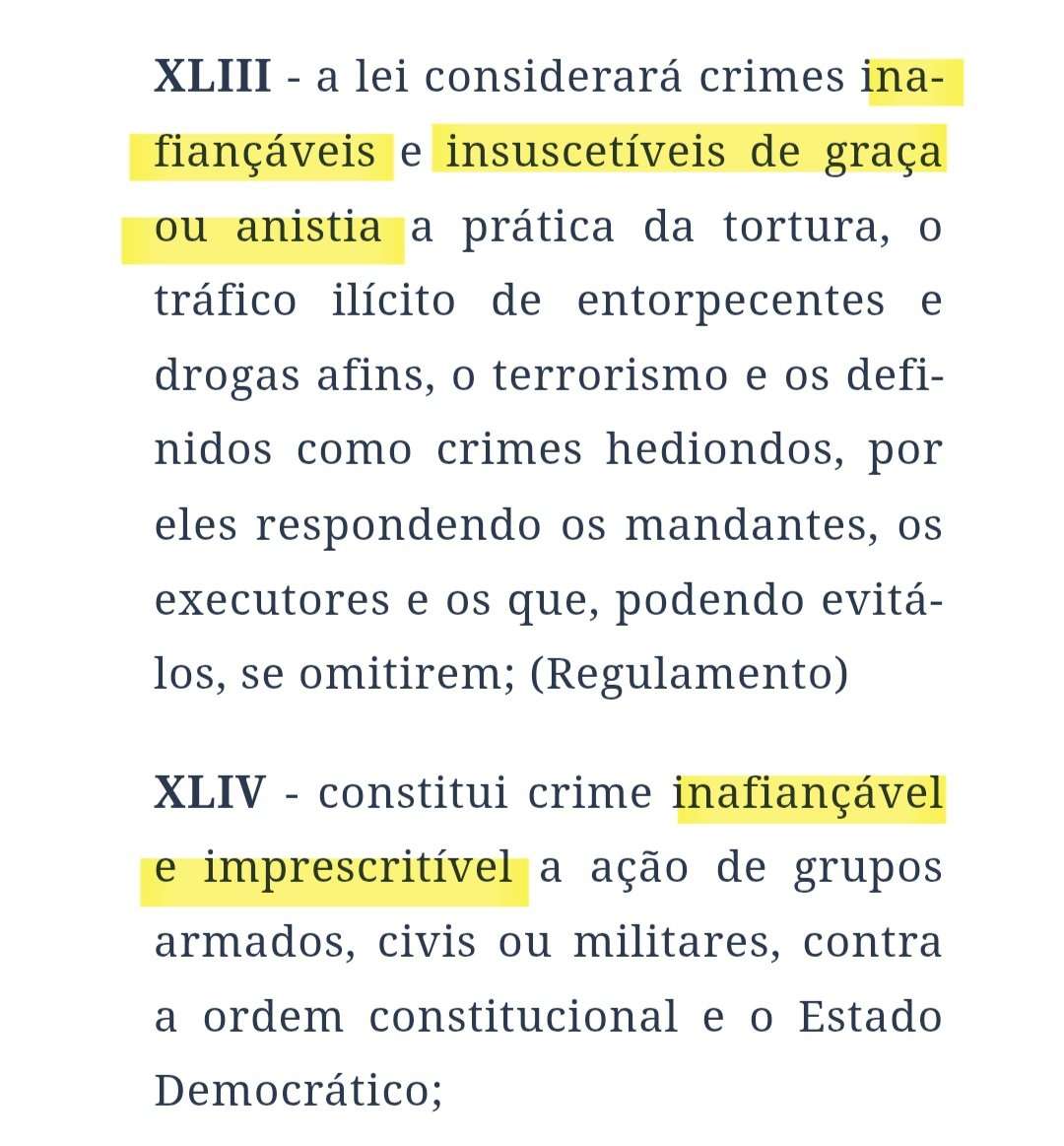 O seguinte, XLIV, INTENCIONALMENTE PERMITE anistia a ‘crimes contra a ordem constitucional e o Estado Democrático’.