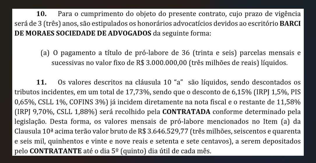 O contrato de Viviane ainda determinava que a advogada organizaria “cinco núcleos de atuação” perante Judiciário, Legislativo, Executivo, Ministério Público e Polícia Judiciária – no caso, a Polícia Federal, que acabaria deflagrando em novembro do ano passado uma operação que levou à cadeia o dono do Master, o executivo Daniel Vorcaro.
