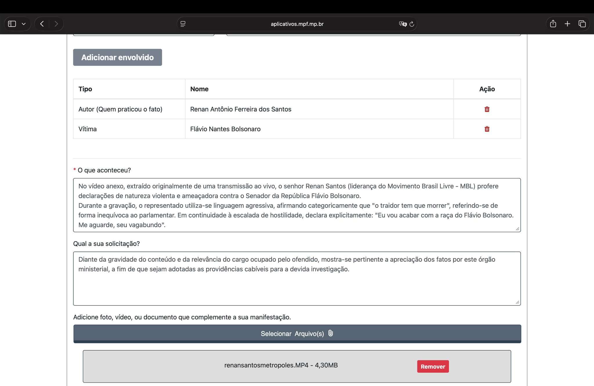 "Acabei de denunciar o líder do MBL ao MPF pelas ameaças de morte feitas contra Flávio Bolsonaro!
