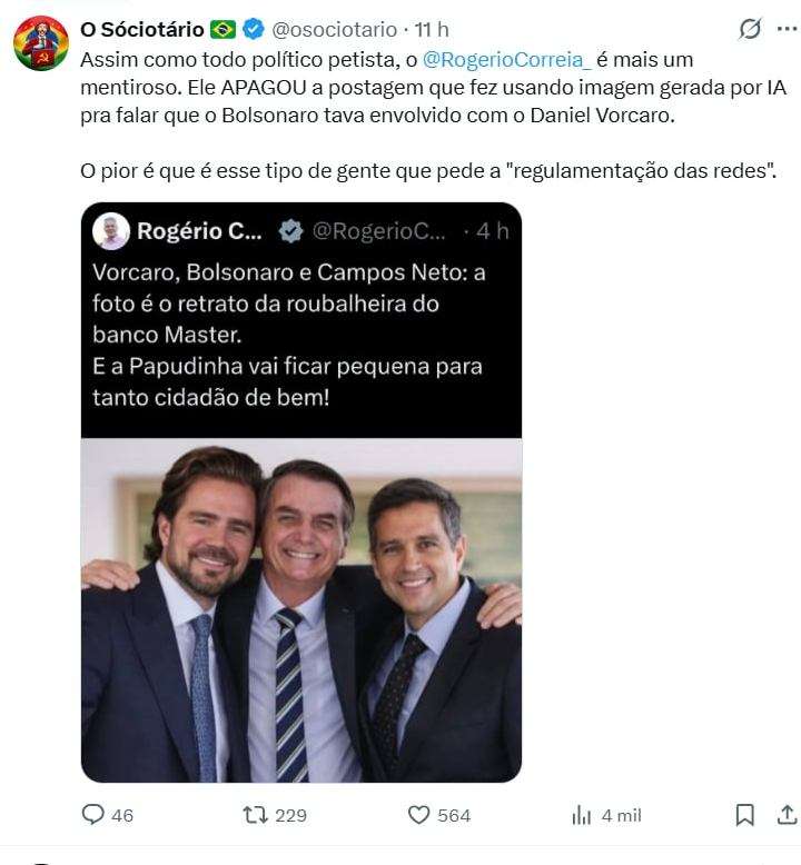 Foi o que fez o deputado petista Rogerio Correia, que manipulou uma foto do ex-presidente Jair Bolsonaro, para acusá-lo de envolvimento com Daniel Vorcaro.