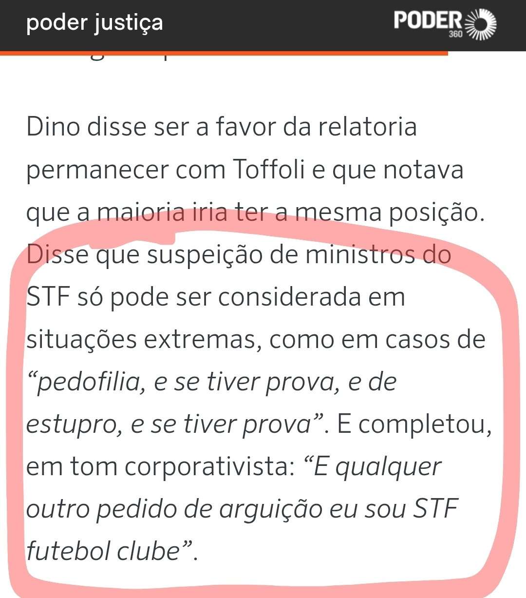 "Dino disse ser a favor da relatoria permanecer com Toffoli e que notava que a maioria iria ter a mesma posição. Disse que suspeição de ministros do STF só pode ser considerada em situações extremas, como em casos de ‘pedofilia, e se tiver prova, e de estupro, e se tiver prova’. E completou, em tom corporativista: ‘E qualquer outro pedido de arguição eu sou STF futebol clube’....