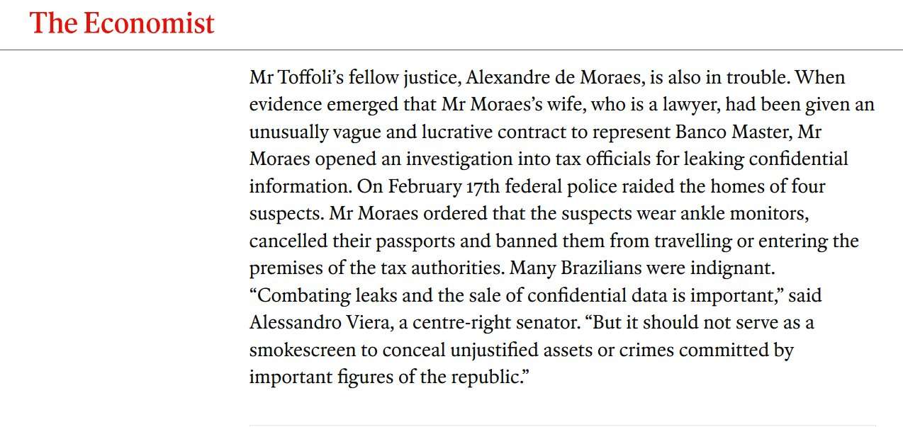 "O colega de Toffoli, o ministro Alexandre de Moraes, também está em apuros. Quando surgiram evidências de que a esposa do Sr. Moraes, que é advogada, havia recebido um contrato incomumente vago e lucrativo para representar o Banco Master, Moraes abriu uma investigação contra funcionários da Receita Federal por vazamento de informações confidenciais. Em 17 de fevereiro, a Polícia Federal fez buscas nas casas de quatro suspeitos. Moraes determinou que os suspeitos usassem tornozeleiras eletrônicas, cancelou seus passaportes e os proibiu de viajar ou entrar nas instalações da Receita Federal. Muitos brasileiros ficaram indignados. ‘Combater vazamentos e a venda de dados confidenciais é importante’, disse Alessandro Vieira, senador de centro-direita. ‘Mas isso não deve servir de cortina de fumaça para ocultar patrimônio injustificado ou crimes cometidos por figuras importantes da República’.”