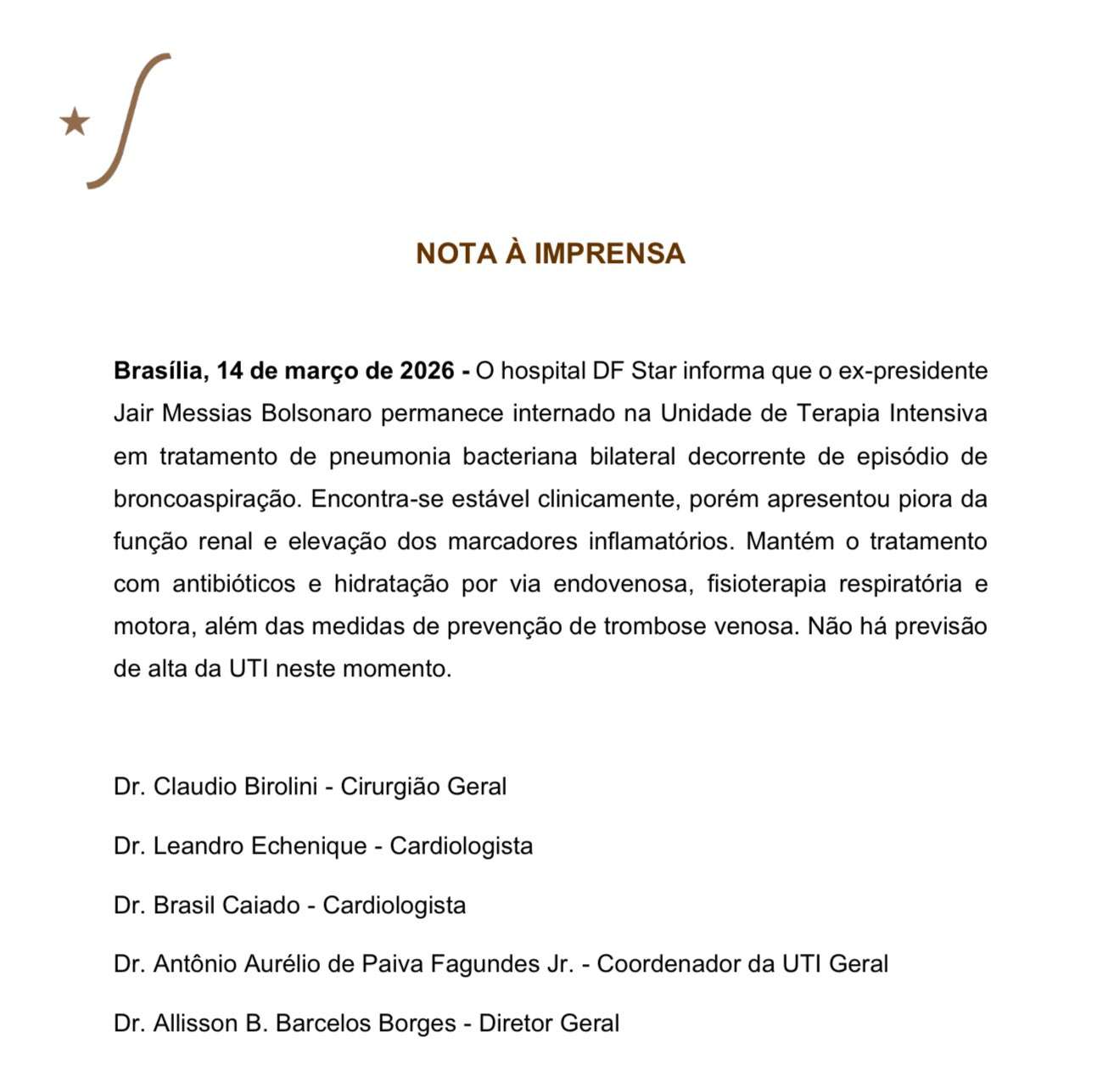 "Encontra-se estável clinicamente, porém apresentou piora da função renal e elevação dos marcadores inflamatórios", diz a nota.