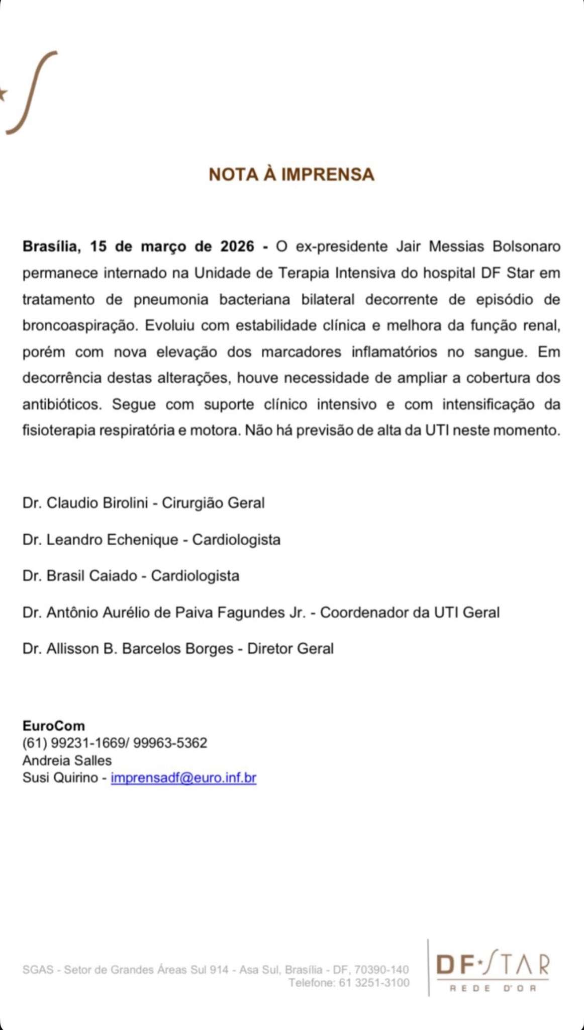 O boletim médico é assinada pelo cirurgião-geral Cláudio Birolini; os cardiologistas Leandro Echenique e Brasil Caiado; o coordenador da UTI Geral, Antônio Aurélio de Paiva Fagundes Júnior; e pelo diretor-geral do hospital, Allisson B. Barcelos Borges.