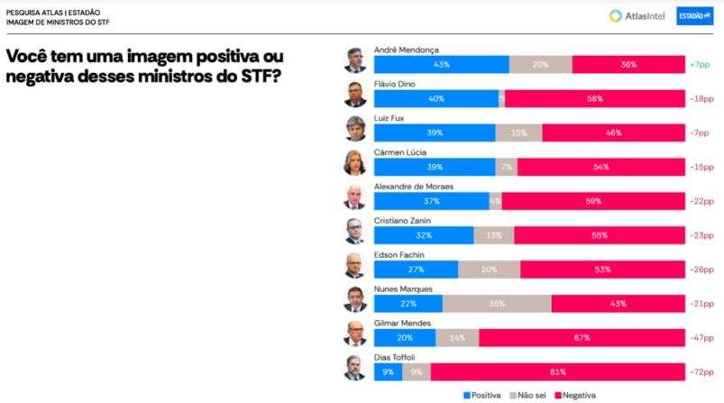 O estudo da AtlasIntel aferiu a percepção dos brasileiros sobre a imagem dos ministros. Os resultados mostram que 9 dos 10 atuais integrantes da Corte são mais rejeitados do que aprovados.