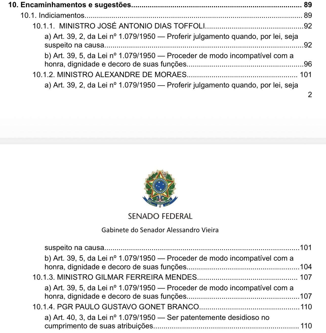 Moraes e Toffoli foram indiciados por “proferir julgamento quando, por lei, seja suspeito na causa” (Art. 39, 2, da Lei n° 1.079/1950) e “proceder de modo incompatível com a honra, dignidade e decoro de suas funções” (Art. 39, 5, da Lei n° 1.079/1950).