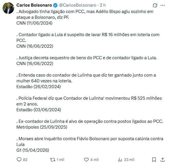 O ex-vereador Carlos Bolsonaro coletou algumas manchetes publicadas nos últimos anos sobre o PCC e o seu vínculo com figuras de estreita ligação com o PT. São reveladoras. Confira: