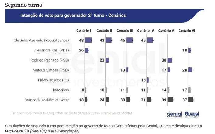 O senador Cleitinho Azevedo (Republicanos) deverá ser o próximo governador de Minas Gerais. Sua liderança é extremamente elástica e já perdura há um ano no mesmo patamar, chegando a atingir mais de 20 pontos acima de seus possíveis concorrentes, segundo pesquisa da Genial/Quaest divulgada nesta terça-feira (28).