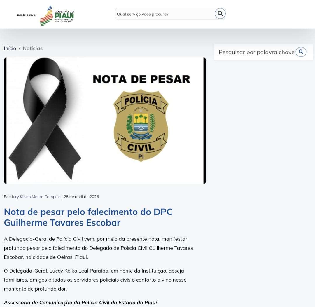 Na manhã desta terça-feira (28), um delegado de polícia civil de 32 anos foi encontrado sem vida dentro de sua residência, localizada no Centro de Oeiras, no Sul do Piauí. A vítima foi identificada como Guilherme Tavares Escobar, que havia assumido recentemente o cargo no município após atuar na Delegacia Regional de Picos (PI).